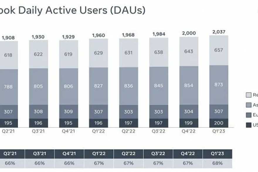 2040 millones: el número de usuarios activos diarios de Facebook en marzo de 2023, frente a los 2000 millones del trimestre anterior