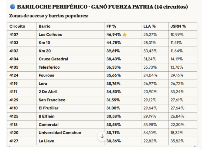 En los 14 circuitos de la periferia y los barrios populares, Fuerza Patria dominó con un promedio cercano al 35%, mientras La Libertad Avanza apenas rozó el 28% y Juntos quedó relegado al 20%. Los Coihues, por ejemplo. 46,94% para Fuerza Patria. Es el barrio donde más votó el kirchnerismo en toda la ciudad, y no es casual. Los Coihues está en el margen, en el borde, en esa zona donde Bariloche empieza a ser otra cosa o deja de ser Bariloche según quién defina qué es Bariloche. Ahí ganó el peronismo con amplitud, con una ventaja de más de veinte puntos sobre La Libertad Avanza. Lo mismo pasó en el Km 10, en el Km 20, en Cruce Catedral, en todos esos lugares que llevan nombres de distancias o referencias geográficasmque lo muestran lejos del centro. Ahí, en los márgenes, Fuerza Patria arrasó.