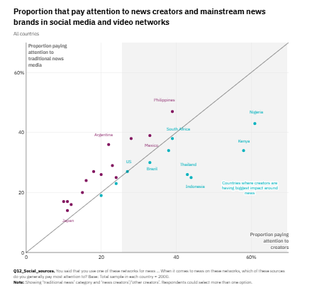 El estudio del Reuters Institute señala que los creadores de noticias —figuras individuales que informan, interpretan o comentan la actualidad— se consolidan como intermediarios de credibilidad. En Argentina, esto se observa en el crecimiento de periodistas que trasladan su audiencia desde la televisión o los portales hacia espacios propios, donde logran mayor interacción y libertad editorial.