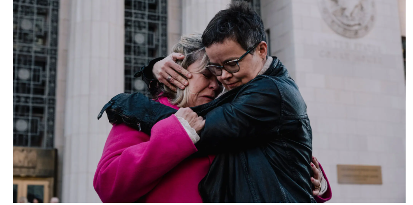 Lori Schott, a la izquierda, recibe consuelo fuera del juzgado de Los Ángeles. Dijo que su hija Annalee se suicidó en 2020, a los 18 años, tras ver vídeos que exaltaban la autolesión.v